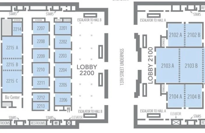 The 2100 and 2200 spaces are separated by 13th street. You can also navigate between them by taking the escalators upstairs and walking through our sponsor area.